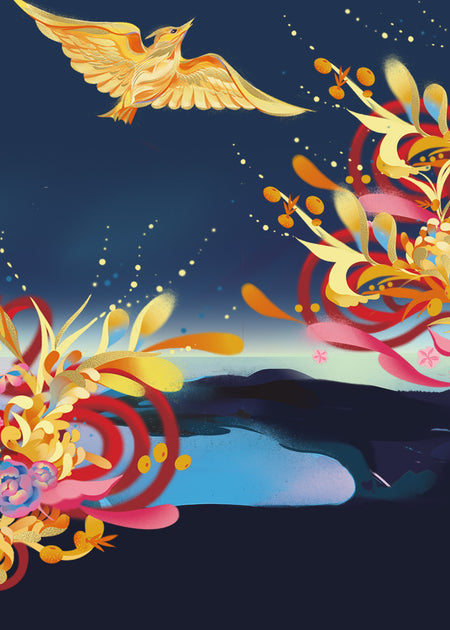The artwork for “The Knotted Tree and Golden Lark” is a vibrant tapestry of symbolism and natural beauty, merging the cultural significance of the Lunar New Year with the pristine landscapes of Tasmania.
