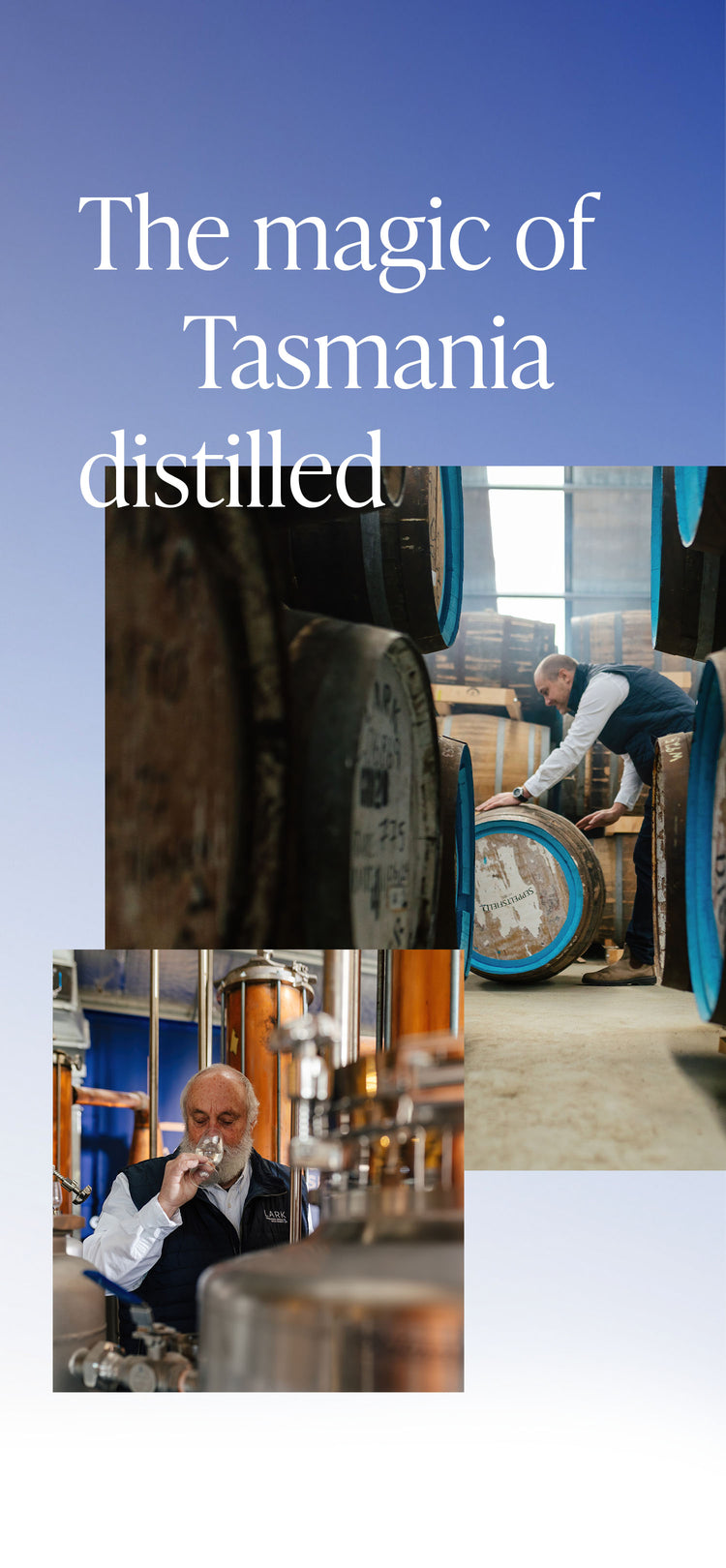 Fuelled by the wonder of Tasmania, we don’t just make whisky – we explore it. From the early days when our founders, Bill & Lyn Lark, challenged the status quo, to today’s team led by our Master Distiller, Chris Thomson, we’ve been pushing boundaries and rethinking what Single Malt Whisky can be.