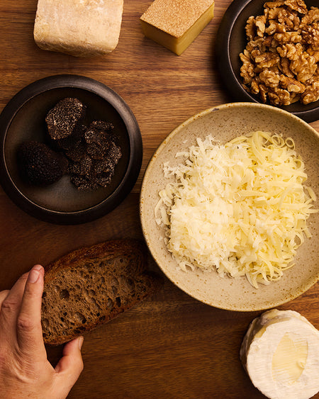 1 Lightly toast the sourdough bread. Grate the Comté and hard sheep’s milk cheese on a coarse grater. Combine the two cheeses together. Preheat your grill then generously top each slice of sourdough with the combined grated cheeses. Place under the grill until the cheese is melted.