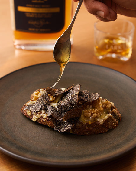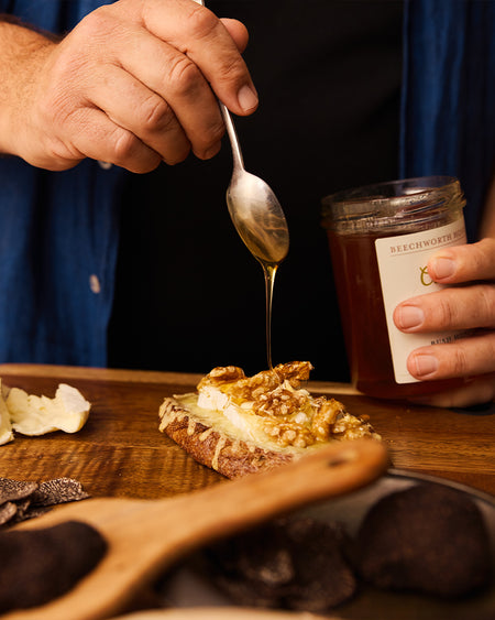3 Finely shave the truffle and divide between the slices, then drizzle half a teaspoon of honey over each slice of cheesy toast.