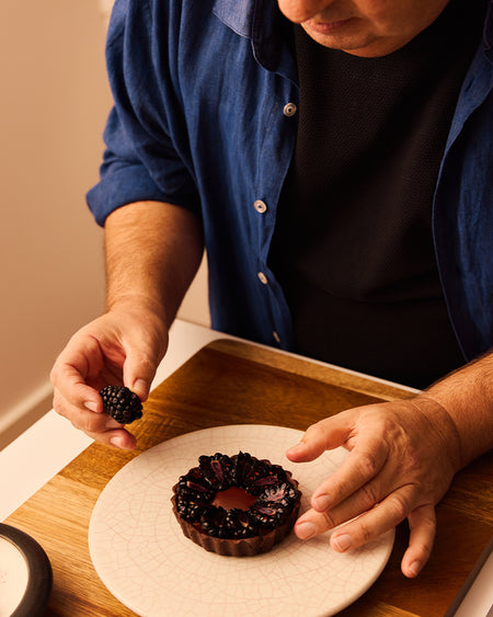 13 Cut the blackberries in half lengthways then arrange the blackberries around the edge of each tart leaving some of the chocolate custard exposed in the middle. Serve immediately.